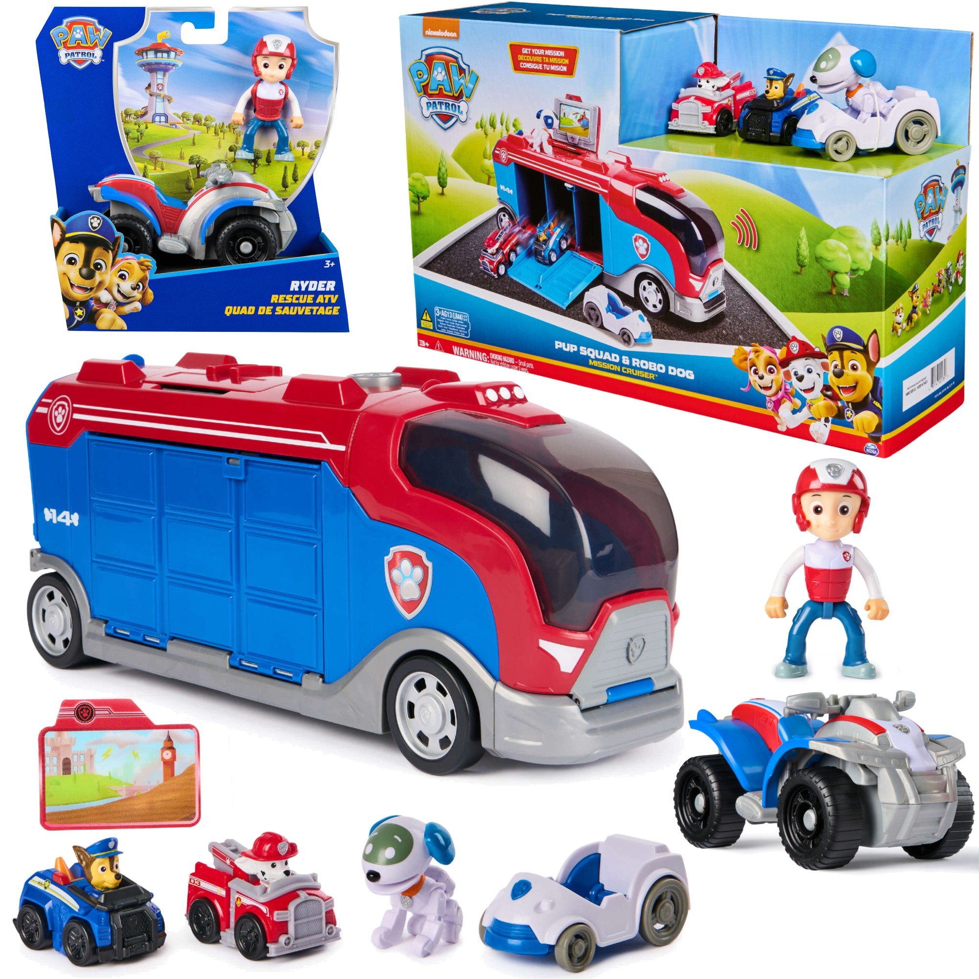 • Mission Cruiser: Duży pojazd z drzwiami otwieranymi za pomocą sprężynymonitorem misji i miejscem parkingowym dla wszystkich piesków z Psiego Patrolu.