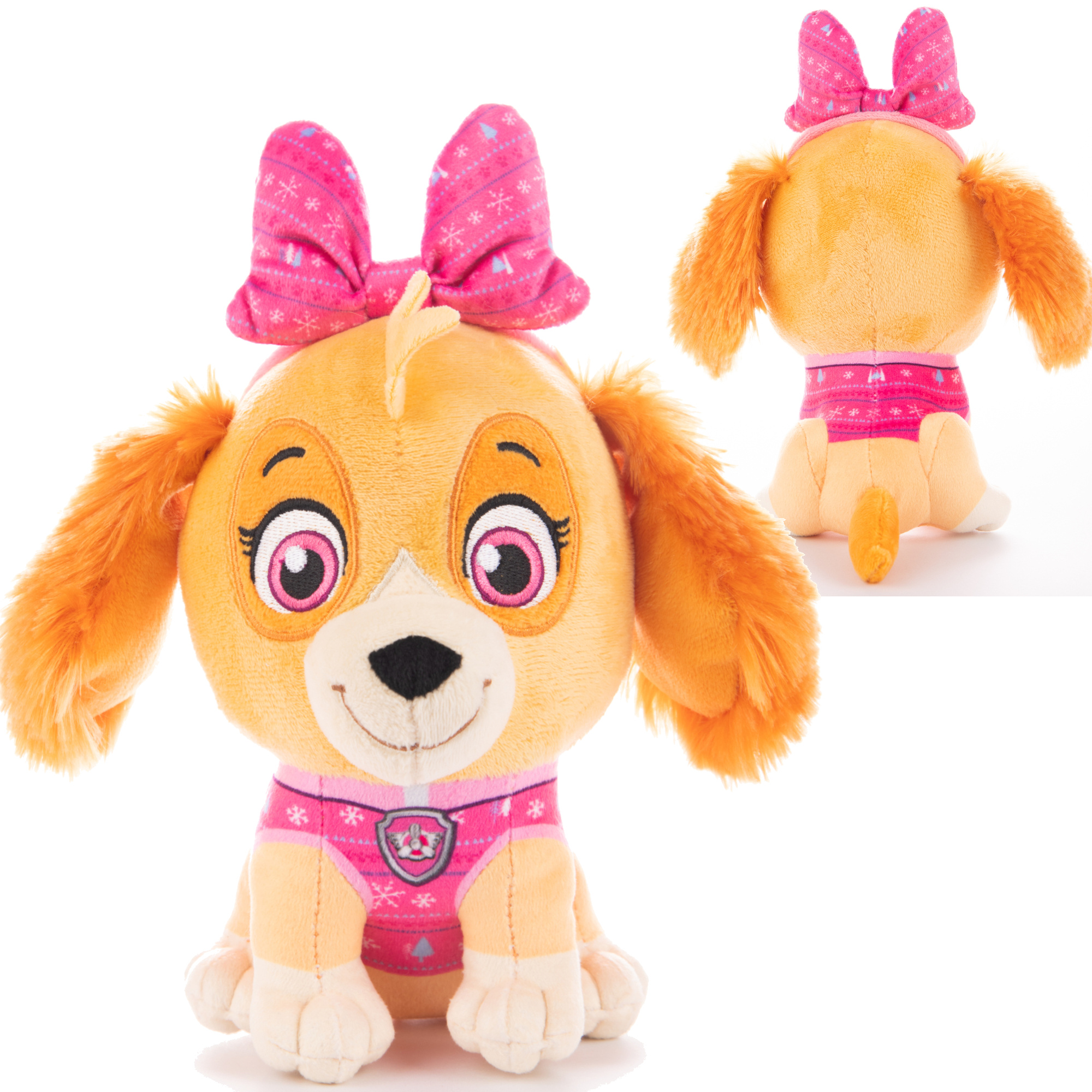 - Maskotka przedstawia Skye - uroczą suczkę z bajki Psi Patrol, ubraną w świąteczny strój. Pluszak ma około 28 cm wysokości i został wykonany z miękkiego, przyjemnego w dotyku materiału. Skye ma charakterystyczne różowe oczy i szeroki, przyjazny uśmiech.