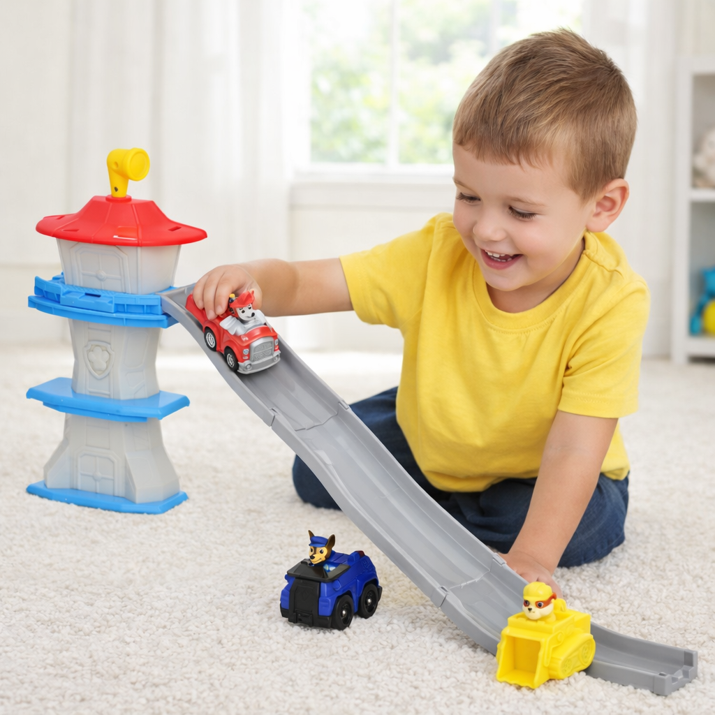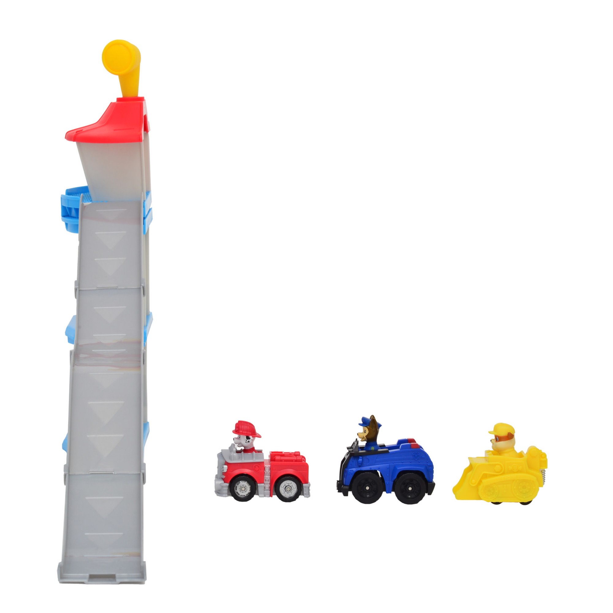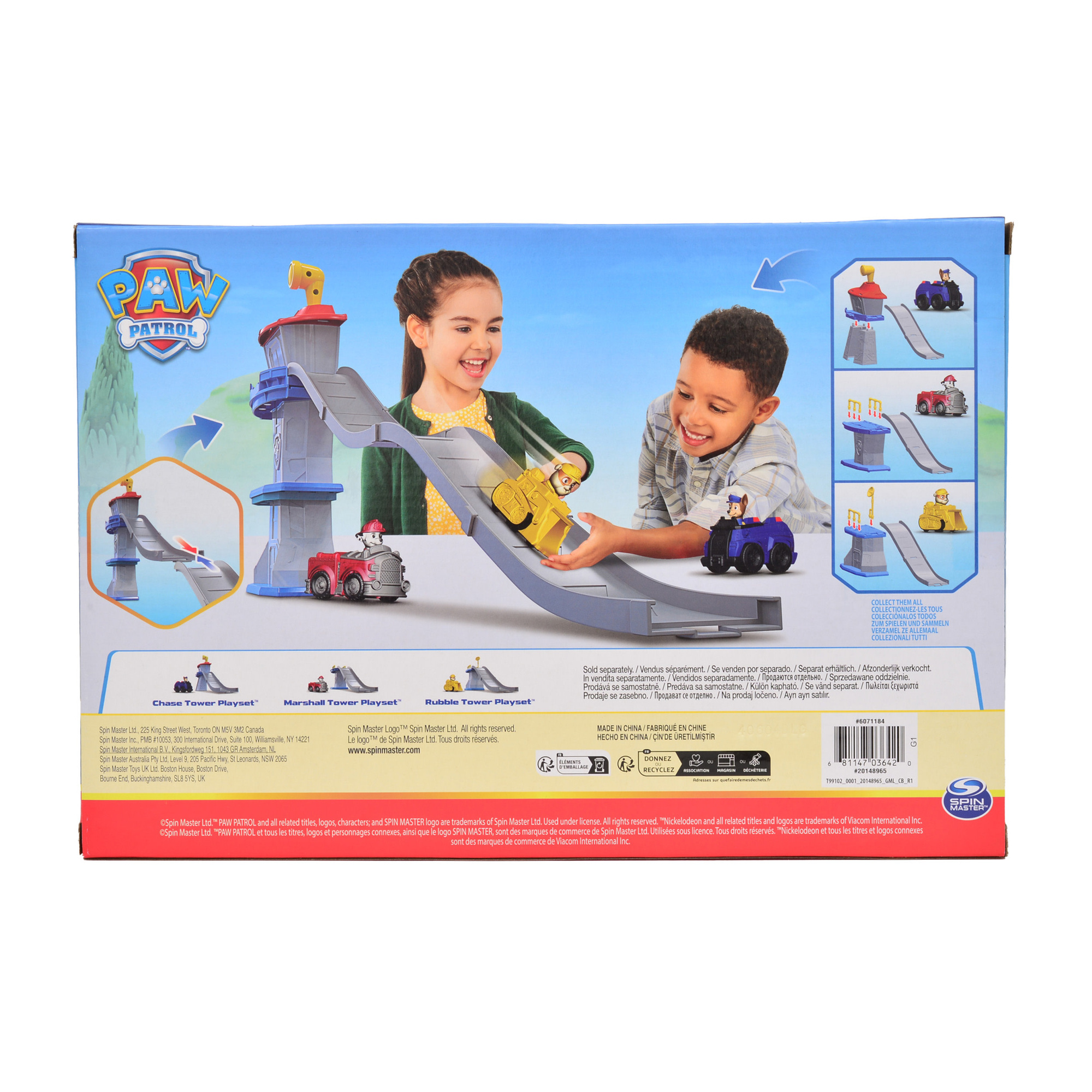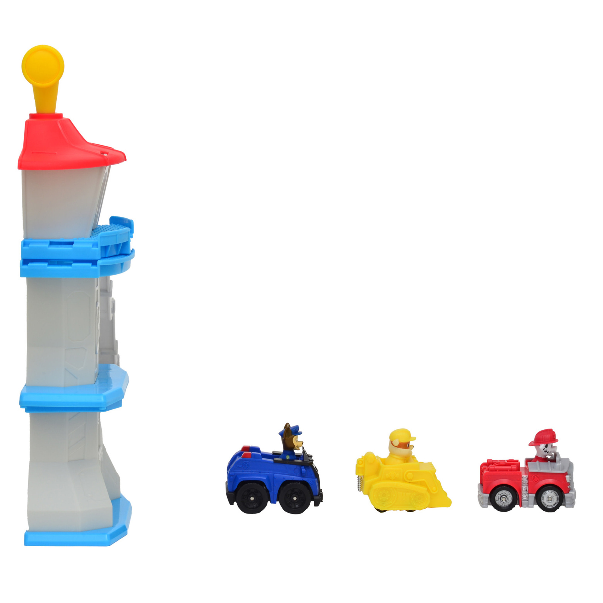 Wieża wiernie odwzorowuje charakterystyczną Wieżę z Adventure Bay znaną z serialu, a pojazdy można popychać ręcznie lub zjeżdżać nimi po rampie, co pozwala na dynamiczną zabawę i realistyczne scenki ratunkowe.