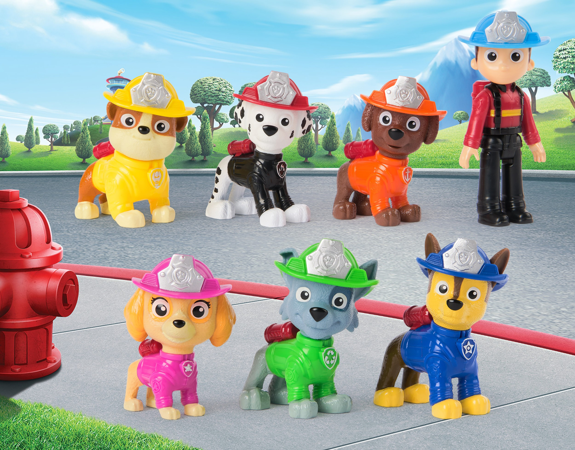 Każdy z piesków jest ubrany w nowy, strażacki strój z serii Fire Rescue, gotowy do gaszenia pożarów i niesienia pomocy mieszkańcom Adventure Bay. Kolorowe kombinezony i kaski nawiązują do charakterystycznych barw poszczególnych bohaterów - niebieskiego Chase’a, czerwonego Marshalla, różowej Skye, żółtego Rubble’a, zielonego Rockiego i pomarańczowego Zumy - dzięki czemu łatwo rozpoznać każdego członka drużyny.