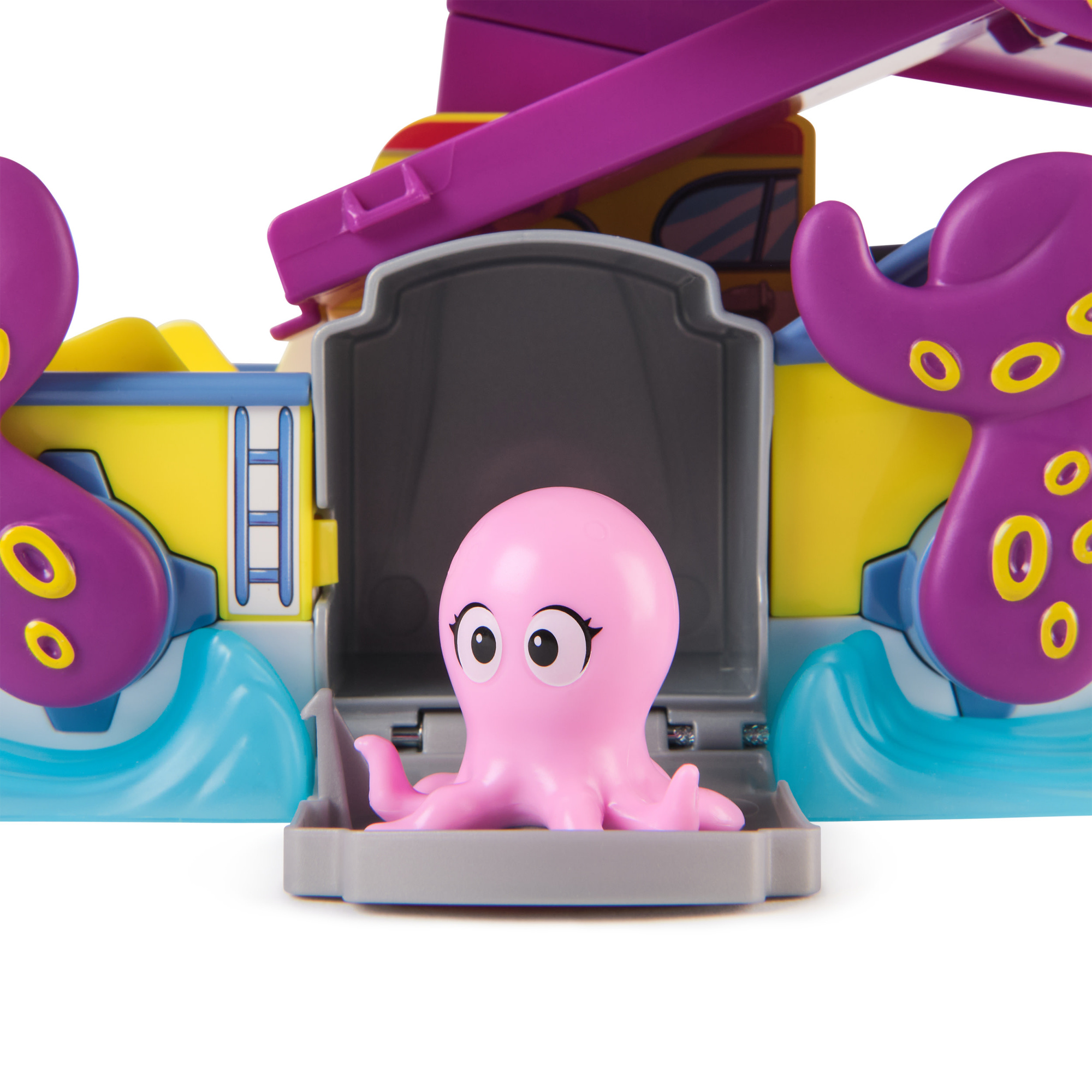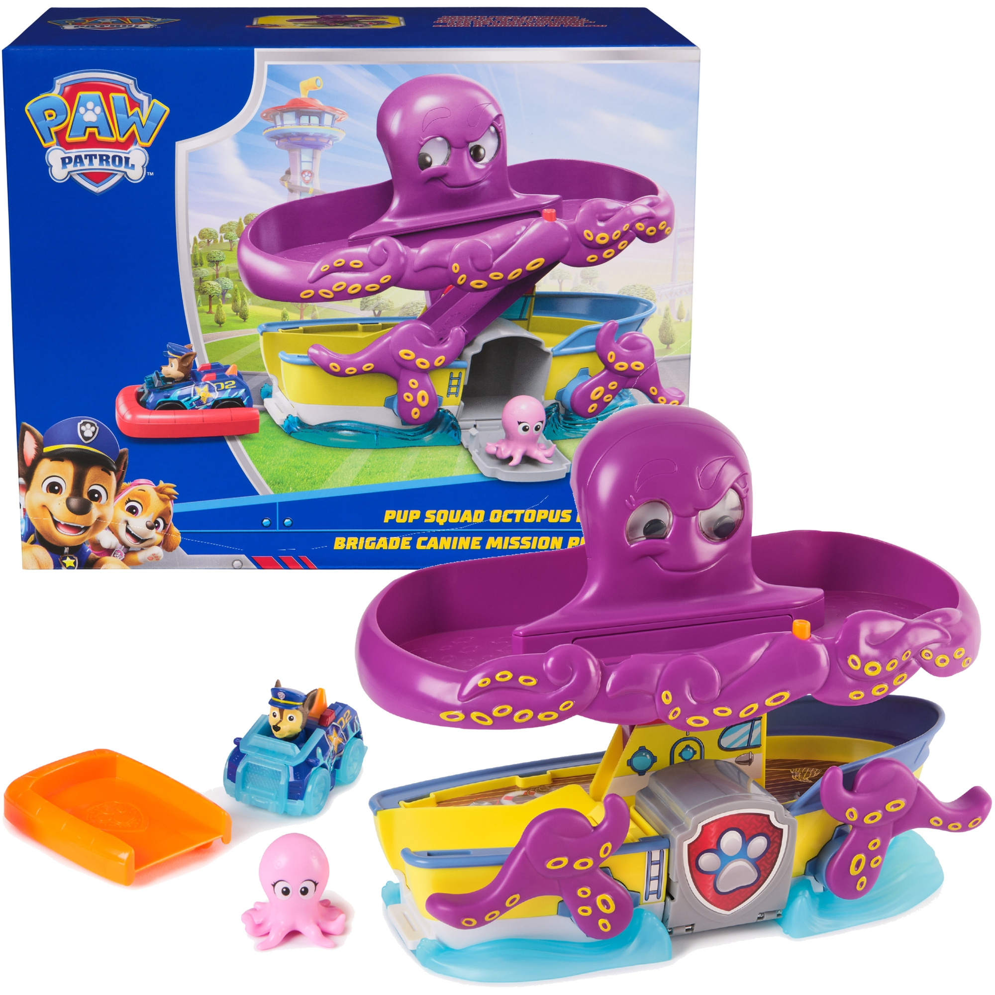- W zestawie znajduje się samochodzik Chase. Dzieci mogą podnosić i opuszczać macki ośmiornicy, aby Chase ścigał się po torze, a następnie nacisnąć przycisk, który opuszcza rampę i pułapkę, umożliwiając uratowanie małej ośmiornicy. Rampa prowadzi Chase’a na